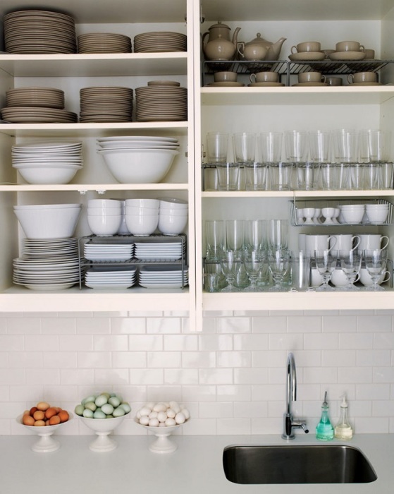 • Выделите полку для предметов, которыми пользуетесь ежедневно – среди них могут быть любимые тарелки, кружки, подносы, на которых вы привыкли подавать завтрак, обед и ужин. Эту посуду нужно всегда нужно держать под рукой. А вот бокалы для вина или шампанского, из которых вы пьете только по праздникам, можно убрать на самую верхнюю полку, чтобы они не маячили перед глазами.