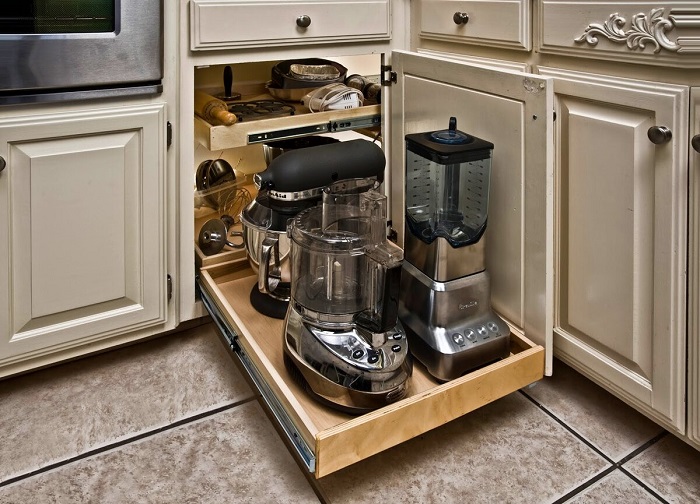 • Бытовую технику – тостер, блендер, миксер, кофеварку и прочие предметы лучше хранить на нижних полках – оттуда их удобнее доставать во время приготовления блюд. Что касается техники, которой вы пользуетесь каждый день (например, электрочайник), то ее можно перенести непосредственно на столешницу.