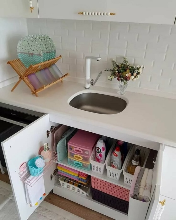 • Чистящие средства – первое правило – бытовой химии нельзя находиться рядом с посудой и едой. Будет лучше, если вы расположите ее в нише под раковиной, предварительно организовав там место для хранения.