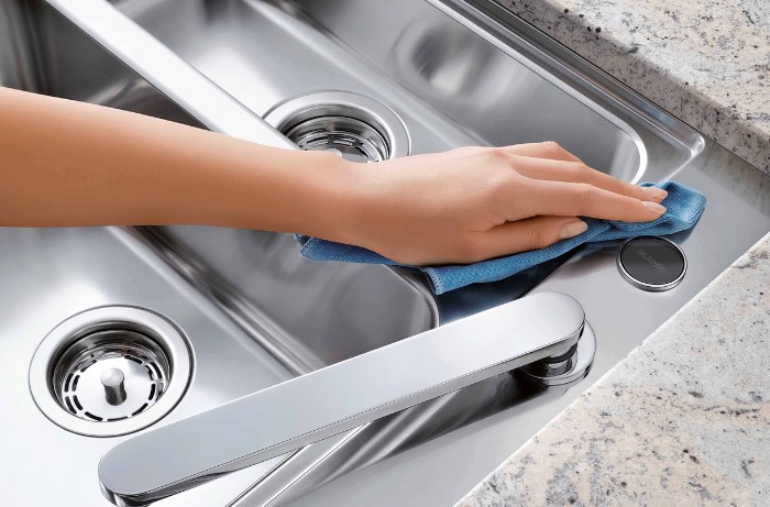 7. По завершению процедуры ополосните мойку и вытрите. Полировать раковину следует мягкой тряпкой и круговыми движениями. Тщательно пройдитесь по краям мойки и вокруг сливного отверстия.
