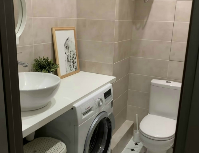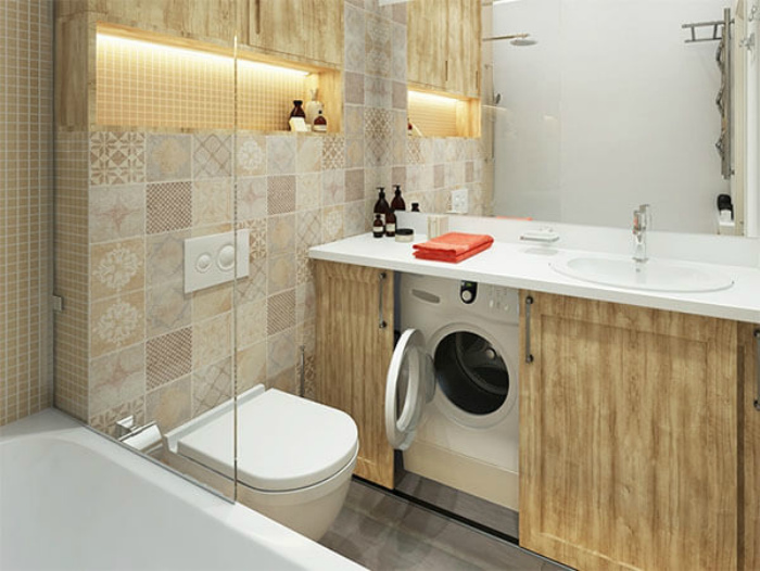 Стиральная машинка под столешницей. | Фото: Труд. На фото - прекрасный пример того, где и как можно разместить стиральную машинку. Дизайнеры убрали верхнюю крышку и установили машинку под столешницей. Если отдать предпочтение накладной раковине с компактным сифоном, рядом со стиральной машинкой еще останется место для вместительной корзины для белья.