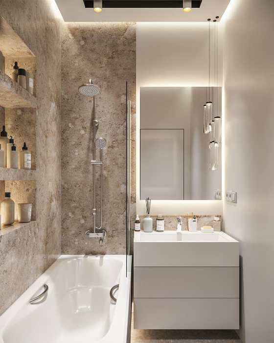 Зонирование ванной комнаты. | Фото: Pinterest. Казалось бы, три квадратных метра, что там зонировать!? Однако дизайнеры считают, что именно такие пространства нуждаются в четких разграничениях. На фото - один из удачных примеров разграничения пространства при помощи разных типов отделки. Стены в зоне с ванной стилизованы под натуральный камень, а место с рукомойником имеет простую белую отделку. В продолжение темы: 10 советов, которые помогут преобразить ванную, даже если речь идет о типовой «хрущевке».