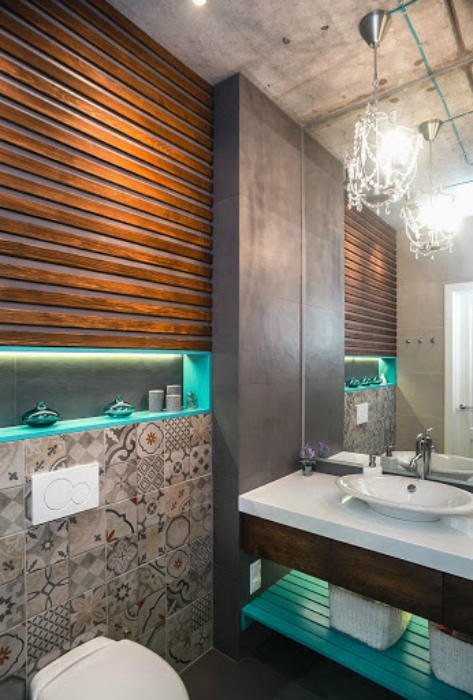 Сочетание разных фактур в интерьере маленького санузла. | Фото: Лаборатория дизайна интерьера. Часто владельцы маленьких ванных комнат вообще не заморачиваются с интерьером, останавливаясь на самой простой керамической плитке. Однако не нужно преждевременно ставить крест на своем маленьком санузле. Дизайнеры уверяют, любое помещение можно сделать интересным, используя разнообразные фактуры и грамотное освещение. Яркий тому пример - ванная комната на фото. В ней удалось «подружить» керамическую плитку с узором, холодный бетон и доски. Ну, а завершает картинку - разнообразное и многоуровневое освещение.