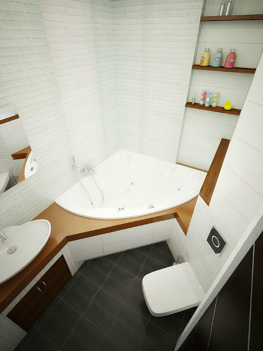 Ванная комната с необычными границами. | Фото: Моя Ванна. Маленькие санузлы - это фишка типовых построек 60-80-х годов. Однако скромный размер - не приговор. С помощью современных материалов и технологий можно самостоятельно скорректировать границы пространства. Взгляните, как оригинально и функционально дизайнеры обустроили эту ванную комнату, разместив в углу джакузи, обшивка которой плавно «перетекает» в шкафчик под мойкой и вплотную прилегает к стене. Остальные предметы обстановки имеют минималистичный дизайн, в таком же стиле подобрана и отделка.