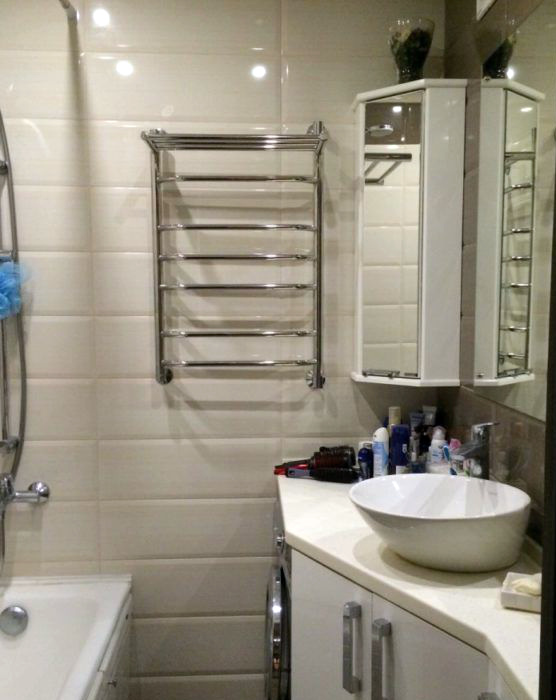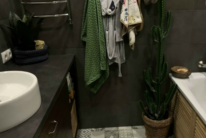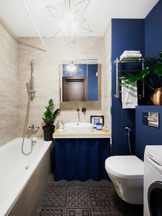 Ценные советы по обустройству крошечной ванны. Ванная комната - это особая часть жилища, из которой многие из нас стараются сделать настоящую конфетку. Но для многих людей непреодолимым препятствием к мечте становится маленькая площадь санузла. Но даже те несчастные квадратные метры, которые «щедрой рукой» выделили большинству из нас советские архитекторы, можно сделать вполне привлекательными. Подробнее об этом - далее в обзоре. 1. Сочетание фактур Сочетание разных фактур в интерьере маленького санузла. | Фото: Лаборатория дизайна интерьера. Часто владельцы маленьких ванных комнат вообще не заморачиваются с интерьером, останавливаясь на самой простой керамической плитке. Однако не нужно преждевременно ставить крест на своем маленьком санузле. Дизайнеры уверяют, любое помещение можно сделать интересным, используя разнообразные фактуры и грамотное освещение. Яркий тому пример - ванная комната на фото. В ней удалось «подружить» керамическую плитку с узором, холодный бетон и доски. Ну, а завершает картинку - разнообразное и многоуровневое освещение. 2. Изменение границ Ванная комната с необычными границами. | Фото: Моя Ванна. Маленькие санузлы - это фишка типовых построек 60-80-х годов. Однако скромный размер - не приговор. С помощью современных материалов и технологий можно самостоятельно скорректировать границы пространства. Взгляните, как оригинально и функционально дизайнеры обустроили эту ванную комнату, разместив в углу джакузи, обшивка которой плавно «перетекает» в шкафчик под мойкой и вплотную прилегает к стене. Остальные предметы обстановки имеют минималистичный дизайн, в таком же стиле подобрана и отделка. 3. Функциональные решения Унитаз-биде в маленьком санузле. | Фото: HappyModern.RU. Маленькая ванная комната - не повод отказываться от комфорта. Далеко не в каждом санузле найдется место для установки отдельного биде, но современная промышленность делает невозможное возможным. К примеру, на фото стандартный санузел в пятиэтажном доме с унитазом-биде. Смеситель биде установили в экран ванны. 4. Искусственные растения Искусственные растения в интерьере ванны. | Фото: Инросстрой. Проблемой многих ванных комнат является отсутствие уюта. В этом нет ничего удивительного, ведь влажная среда и отсутствие света - не самые благоприятные условия для живых растений, картин и деревянной мебели. Однако, если вы твердо решили, что в вашем санузле должны быть растения, выбирайте искусственные. Несмотря на то, что дизайнеры плохо относятся к этому украшению, в ванной комнате - можно! Только постарайтесь выбрать те, что максимально похожи на настоящие, и приготовьтесь к тому, что время от времени их придется менять. 5. Стильная машинка Стиральная машинка под столешницей. | Фото: Труд. На фото - прекрасный пример того, где и как можно разместить стиральную машинку. Дизайнеры убрали верхнюю крышку и установили машинку под столешницей. Если отдать предпочтение накладной раковине с компактным сифоном, рядом со стиральной машинкой еще останется место для вместительной корзины для белья. 6. Шторка Шкафчик со шторкой. | Фото: Пуфик. По мнению Novate.ru, сделать интерьер ванны уютней помогут шторки, но не те, что вешают на окна. Взгляните на фото, в этом интерьере дизайнеры заменили дверцы шкафчика на плотные синие шторки. Такое решение выглядит очень св