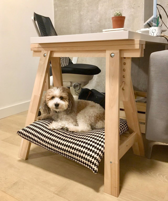 У многих раскладных письменных столов для школьников и взрослых снизу есть основание, которое образует своеобразный остов для будущей кроватки для вашего кота или собаки. Если остов не Х-образный, то достаточно просто положить одну добавочную доску или фрагмент фанеры. Это может быть даже плотная крышка от большой коробки из-под обуви. Идея проста и гениальна. Собаки и коты обожают все новое, а так же быть поближе к хозяину, так что если они увидят новую лежаночку там, то придут на неё и надолго там задержатся.
