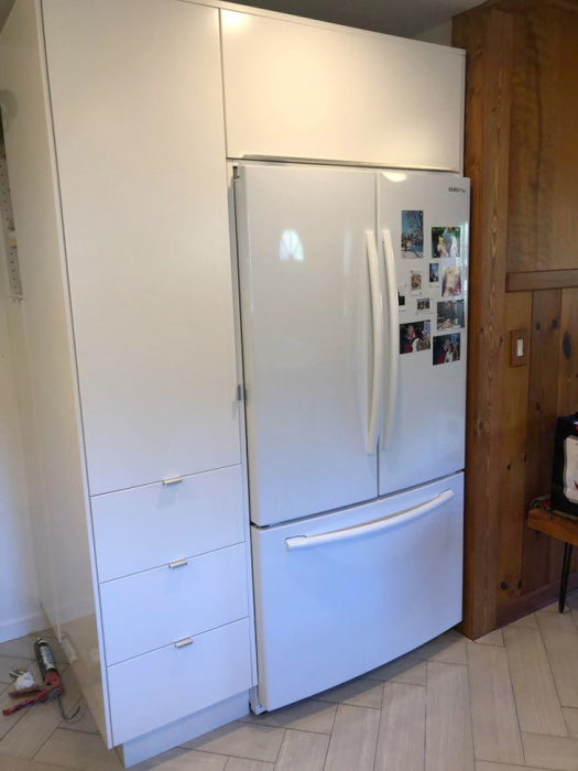 Немногие люди осознают, что покупная мебель намного дороже, чем заказанная из распила. Данная идея поможет сэкономить буквально до 50 процентов места в вашей кухне. Ставим холодильник в удобное место в углу. Затем заказываем по чертежу из распила подходящие шкафы, которые будут располагаться сбоку и над холодильником. Теперь все продукты, вся посуда и вся кухонная утварь умещаются всего лишь в 6 квадратных метрах, но... В ВЫСОТУ!!!
