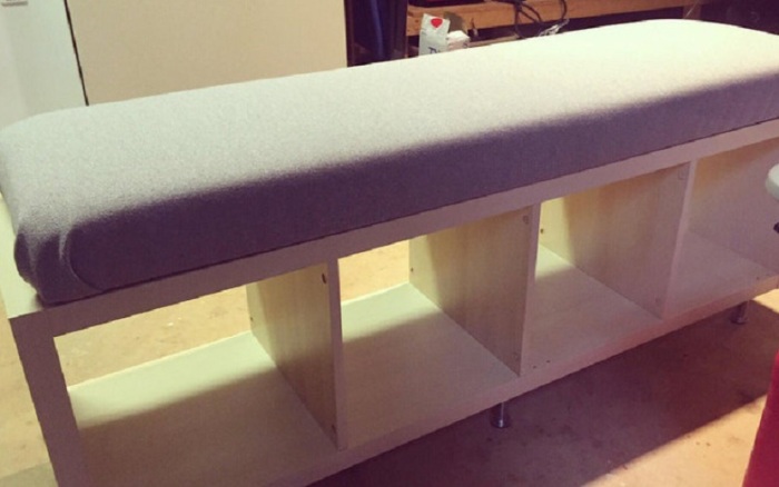 Сквозная полка или стеллаж стоят недорого. Приобретите сквозную полку, затем поставьте в удобное место в кухне на бок, организуйте внутри полок зону хранения для чайников и подносов, а вот сверху сделайте сидение из поролона и ткани. Подойдет любой фрагмент фанеры. Очень простое решение!
