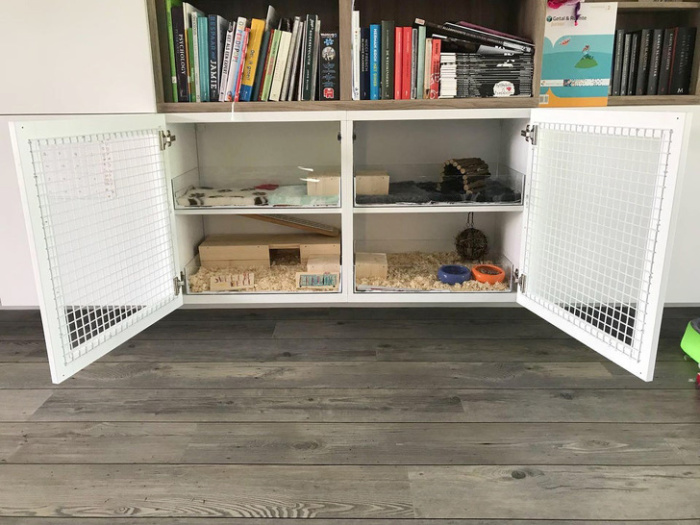 Если у вас живет питомец-грызун, такой, как шиншилла, морская свинка, крыса или кролик, то им нужно много места. Если селить животное в аквариуме из стекла, то весит он тонну и требует специального места для размещения, если покупать большую клетку, то она стоит очень дорого. Куда проще вмонтировать жилище для грызуна в уже имеющуюся тумбу. Просто идеально!