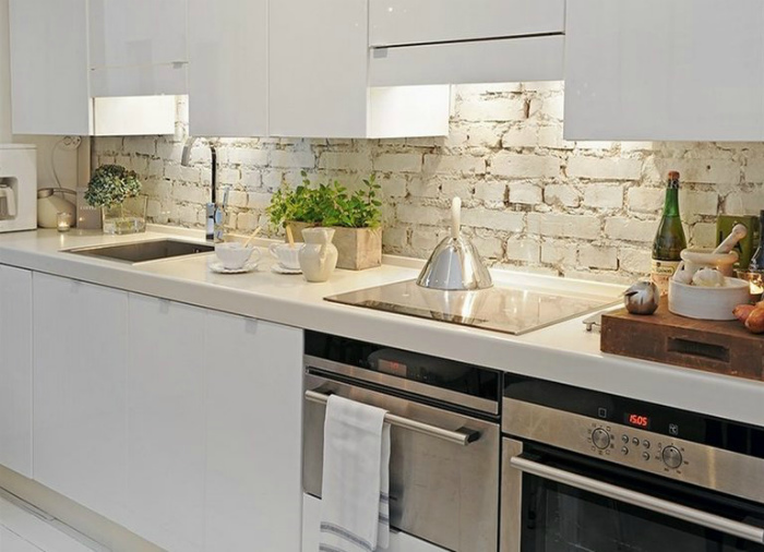 Каменные фактуры выглядят очень изысканно и стильно, однако, многие опасаются использовать их на кухне. Дело в том, что камень, сам по себе пористый, а значит, производить уборку будет затруднительно. Тем не менее, дизайнеры нашли выход - лаковое покрытие. Такой прием позволит обзавестись стильным фартуком и не переживать о том, что он запачкается.