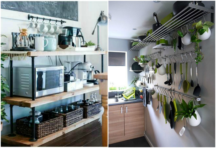 Взгляните на фото, на боковой стенке шкафчика вы можете заместить оригинальный открытый стеллаж с двумя полочками. Это маленькая, на первый взгляд, деталь сделает кухню более функциональной, а если разместить стеллажи и рейлинги на каждой свободной стенке, удастся разгрузить целый шкафчик.