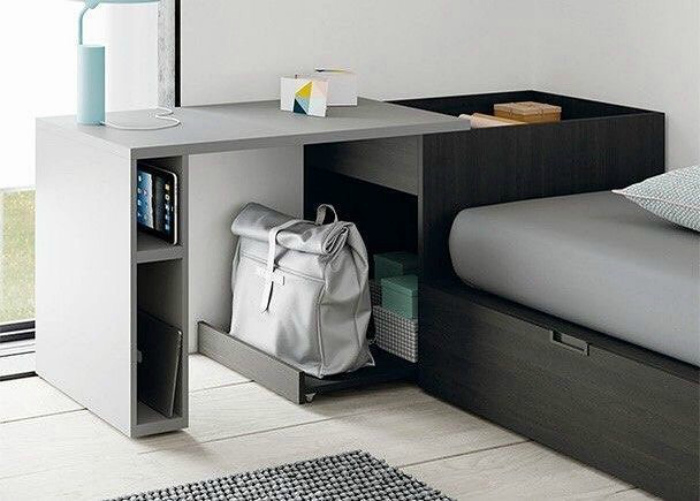 Выдвижной столик на направляющих. | Фото: Pinterest. Современная модульная мебель создана для того, чтобы сделать быт людей, проживающих на маленькой площади, комфортнее. Этот стильный компактный столик на направляющих, установленный возле кровати, - яркое тому подтверждение. В сложенным виде столешница становится частью прикроватной тумбы, но стоит потянуть его на себя - он превратится в полноценный удобный рабочий стол.