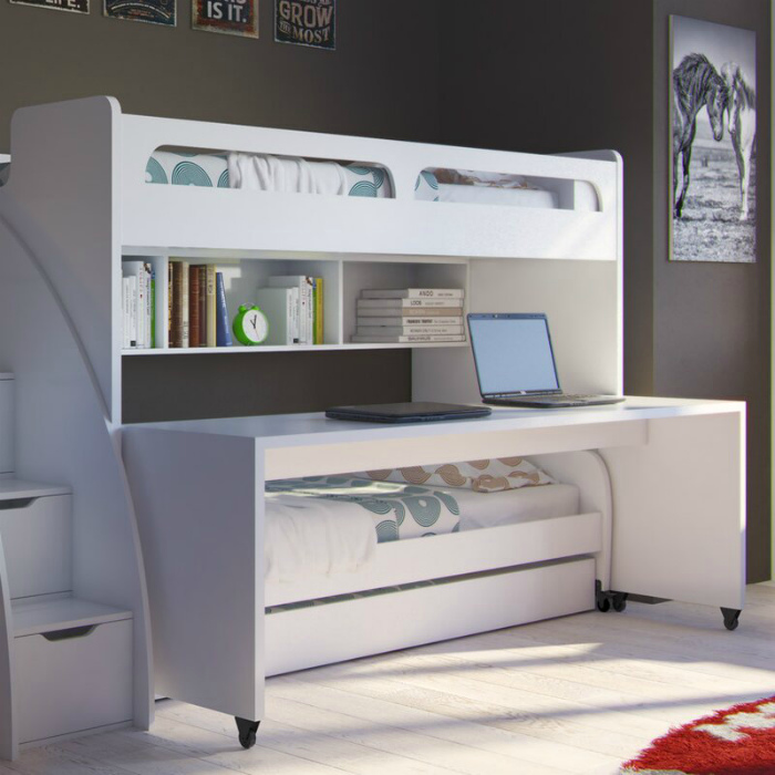 Двухэтажная кровать со столиком. | Фото: Pinterest. Очень функциональная двухъярусная кровать, которая станет настоящим спасением для маленькой детской. Помимо двух спальных мест, конструкция оборудована массивной лестницей со шкафчиками, полочкой и столом на колесиках. За ненадобностью, стол можно задвинуть и он станет частью кровати.