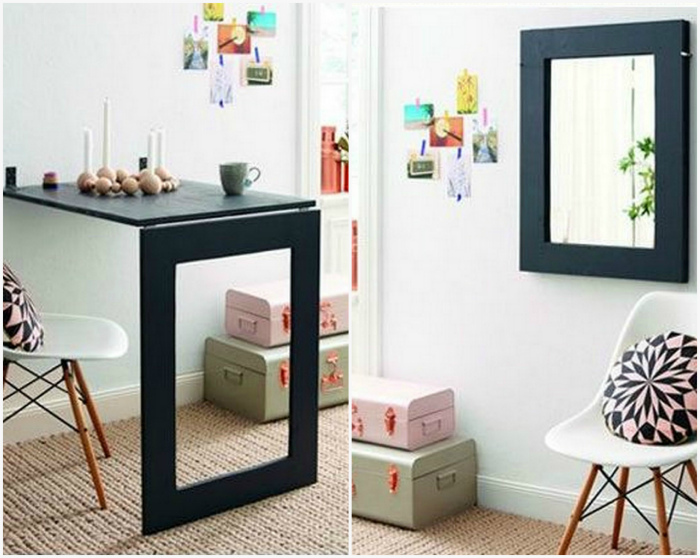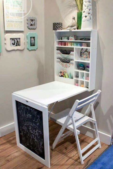Функциональный рабочий стол. | Фото: Decomagz. Мечтаете о собственном уголке для работы и творчества, но в квартире катастрофически не хватает места? Стоит обратить внимание на современные складные конструкции. Стол такого типа по щелчку пальцев превращается компактный настенный шкафчик. Кстати, опорная часть может быть оборудована грифельной доской или узкими полочками, которые также можно использовать для работы.
