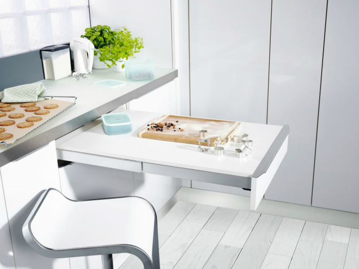 Выдвижной столик на кухне. | Фото: Pinterest. Эргономичные конструкции особенно актуальны на наших маленьких кухнях. Благодаря им можно добиться функциональности даже в самом скромном пищеблоке. К примеру, выдвижной стол под столешницей позволит обзавестись маленькой обеденной зоной или дополнительной рабочей поверхностью для приготовления блюд.