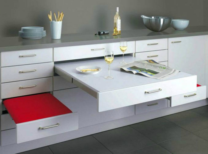 Набор выдвижной мебели для кухни. | Фото: Dobrzemieszkaj.pl. Выдвижной стол и два табурета, встроенные в гарнитур, - пожалуй, лучшее решение для небольшой российской кухни. В сложенном виде такие предметы практически не видны, зато в разобранном способны полностью заменить стандартную мебель.