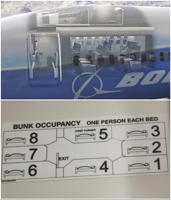 Справка: Дополнительные отсеки над салоном авиалайнеров предусмотрены только в следующих моделях: Boeing 747, 787 Dreamliner и Airbus A380, а также в тех Boeing 777, которые совершают трансатлантические перелеты. Иными словами, те самолеты, полет которых длится более 12 часов (что превышает предельно допустимое время для работы экипажа), оборудованы комнатами отдыха и сна.