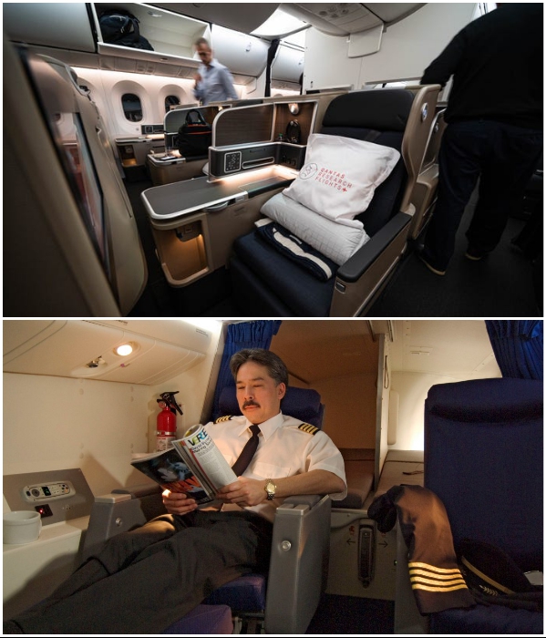 Комнаты отдыха для пилотов отличаются от спальных зон стюардесс. | Фото: businessinsider.com/ bigpicture.ru. А вот для пилотов организованы свои личные комнаты отдыха и располагаются они над кабиной управления. Единственное, они оборудованы не стационарными кроватями, а раскладывающимися креслами как для пассажиров бизнес-класса. Там же установлены панель управления и связь с членами экипажа. В этом отсеке имеется и отдельный туалет. Интересный факт: В октябре 2019 г. самолет самой большой авиакомпании Австралии — Qantas Airways Limited в рамках программы «Project Sunrise» совершил экспериментальный беспосадочный рейс между Нью-Йорком и Сиднеем. Расстояние в 15,59 тыс. км авиалайнер преодолел за 19 часов. Основной целью полета стало определение возможностей членов экипажа поддерживать нужную атмосферу в салоне и безопасность движения, ведь испытательная программа рассчитана на то, чтобы открыть регулярные коммерческие рейсы из Сиднея в Нью-Йорк и Сиднея в Лондон (17 тыс. км, в полете 20,2 часа).