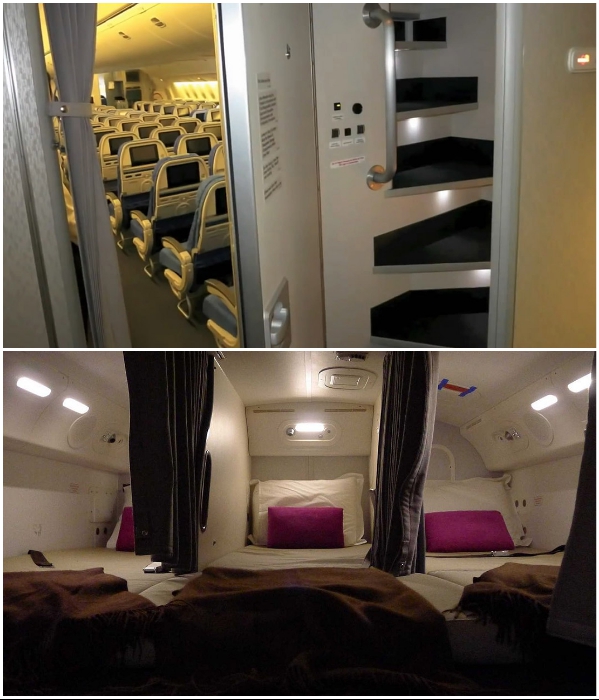 Если кому доведется совершать трансатлантический перелет, который будет длиться более 12 часов, не пугайтесь, когда вдруг увидите стюардесс, спускающихся откуда-то с «крыши» самолета. К счастью, столь удивительное зрелище не плод воображения, а реальность, ведь именно в верхней части некоторых авиалайнеров находятся спальные места для тех, кто заботится о пассажирах во время пути.