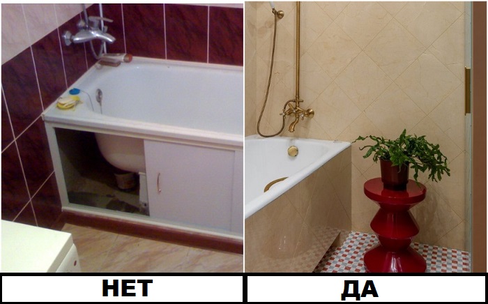 Экран – отличная вещь, так как за ним можно спрятать всю бытовую химию, которая стоит под ванной. Кроме того, данное ограждение поможет аккуратно замаскировать канализацию, трубы и водопровод, сохраняя эстетичный вид комнаты. Однако, если выбрать стандартную модель, то во время некоторых процедур (стирки в тазу, мытья головы) пальцы будут упираться в экран.