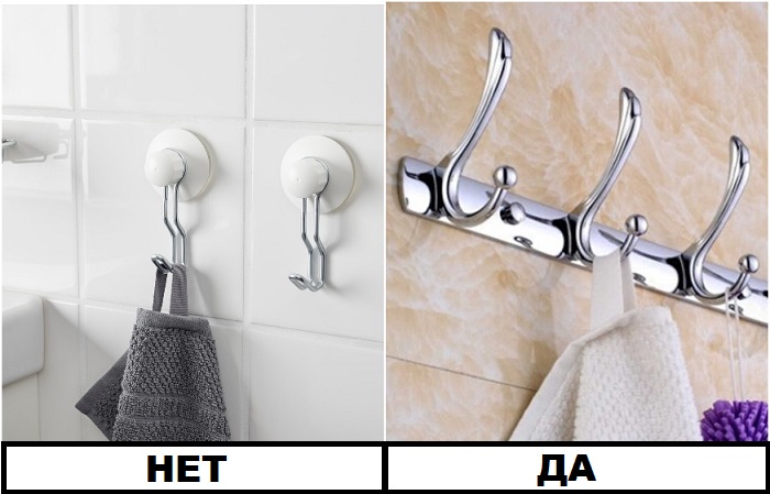 Что делать: Лучше выбрать более надежные способы крепления: саморезы, дюбеля, жидкие гвозди и так далее. Также необходимо учесть и месторасположение крючков: лучше всего смонтировать их рядом с полотенцесушителем и ванной, чтобы банные принадлежности висели поближе к человеку, который совершает водные процедуры.