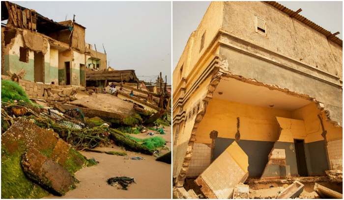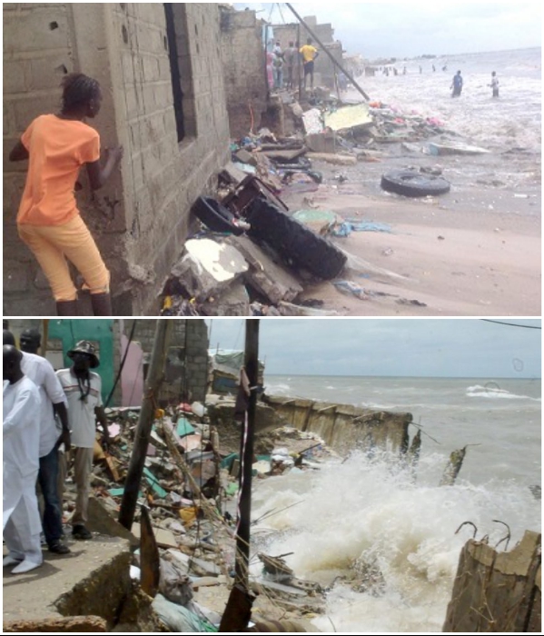 В добавок к этой напасти, во время сильных штормов многие рыбацкие деревеньки, теперь уже острова, оказались полностью под водами Атлантики. Так, например, рыбацкий район Гет-Н'дар (Guet N’dar) был полностью накрыт 4-метровой волной в сентябре 2017 года. В одну ночь Атлантический океан поглотил 100 домов, школу, мечеть и часть кладбища. Благо, что в нем проживали рыбаки, которые по вторичным признакам распознали надвигающую беду и успели вывести всех жителей в безопасное место. Бездомных поместили в импровизированный лагерь рядом с аэропортом, в котором они обитают до сих пор. Даже несмотря на то, что океан со временем частично отступил, после себя он оставил полную разруху.