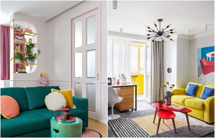Впрочем, если комната сама по себе броская, желтый, бирюзовый, оранжевый диван также можно будет вписать в помещение. Получится эдакий интерьер в стиле китч. Однако, чтобы не переборщить и не превратить его в безвкусную картинку, следите, чтобы цвет дивана хорошо сочетался с другими предметами, присутствующими в комнате.