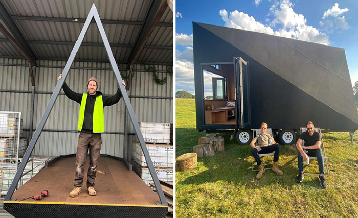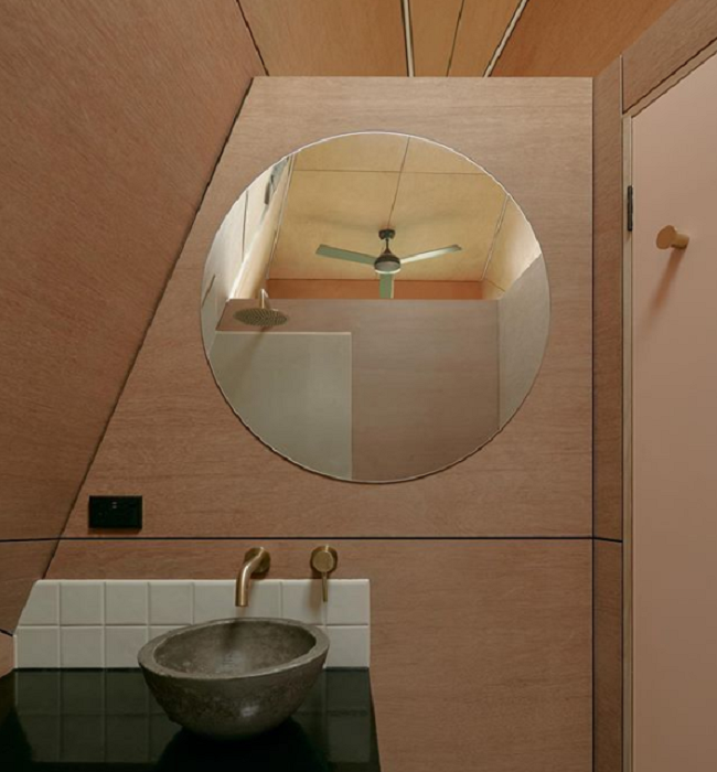 Спальная зона расположена у треугольного окна в конце микро-домика на колесах («Base Cabin», Мельбурн). | Фото: dezeen.com/ newatlas.com.