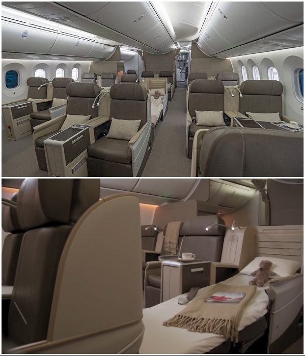 Все эти зоны имеют огромные как для авиалайнера иллюминаторы, из которых открывается фантастический обзор, причем с любой зоны или уединенного спального места. Также стоит отметить, что на оформлении интерьера французский дизайнер Jacques Plerrejean вместе со своей командой совсем не экономил: эксклюзивная мебель из красного дерева и с кожаной обивкой, полированный светлый мрамор и цельный массив дуба в отделке ванных комнат, изысканный текстиль и дизайнерская посуда, ультра современная техника и наборы туалетных принадлежностей от Jo Malone. Все это великолепие поддерживает в порядке вышколенный экипаж, который также одет в дизайнерскую форму.