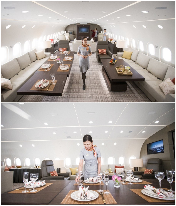 Обеденная зона на борту самого роскошного частного авиалайнера VVIP Boeing787 Dream Jet. | Фото: germany.nashieu.com.