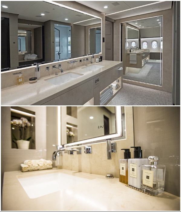 Одна из ванных комнат для пассажиров из общей каюты (VVIP Boeing787 Dream Jet). | Фото: bigpicture.ru.