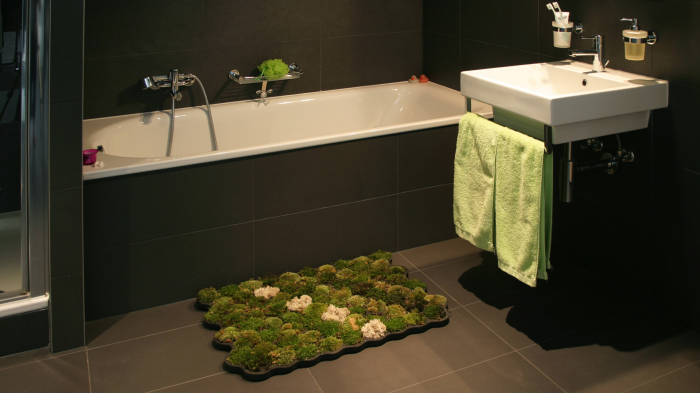 Коврик из мха — это не только красиво и оригинально, но еще и очень полезно. Постелив такой в ванной комнате, можно каждый день наслаждаться приятным микромассажем ног, который будет улучшать кровообращение и ток лимфы. Да и самому коврику в комнате с повышенным уровнем влажности будет комфортнее, чем в каком-либо другом помещении. Особенно сильно такое дополнение придется по вкусу тем, кто любит прогулки босиком по мягкой травке или мху.