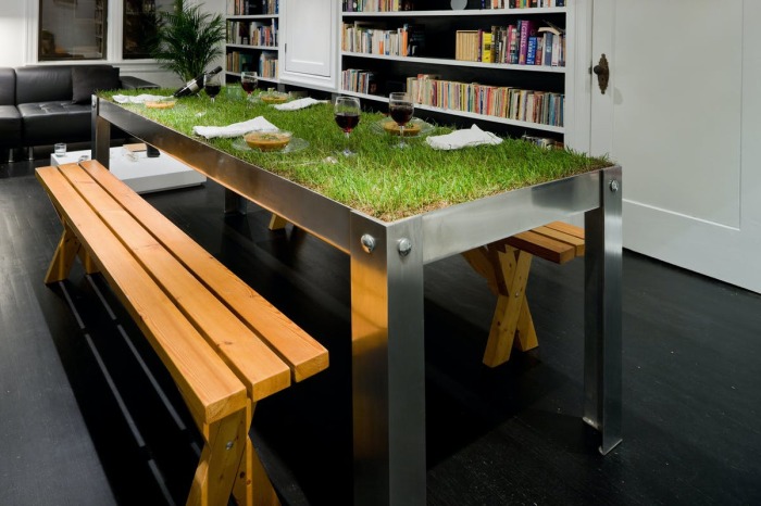 Даже в тесном помещении можно почувствовать себя будто на пикнике. Ожившие столы с настоящей травой, которая растет по всей поверхности столешницы или в ее центре — это удивительная возможность объединиться с природой и во время трапезы почувствовать больше свободы, естественности и красоты. Насыщенный зеленый цвет сочной травы способствует активизации сил, улучшению аппетита и генерации интересных идей, поэтому этот дизайнерский ход отлично подойдет как для офиса, так и собственного жилья. Подобный оригинальный прием можно использовать не только для столов, но и кухонных столешниц или подоконников.