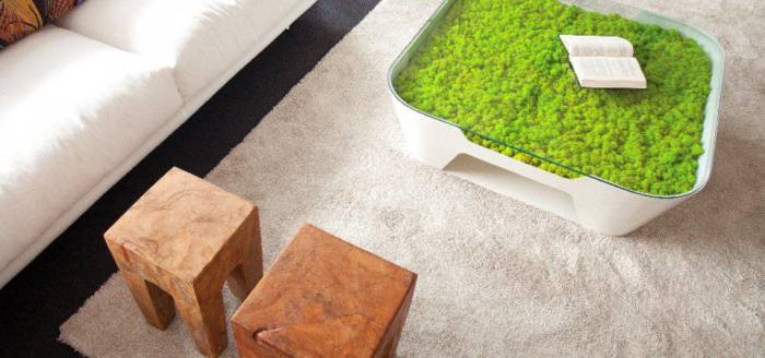 Журнальный столик, поверхность которого полностью заполнена мхом. /Фото: topiar.ua