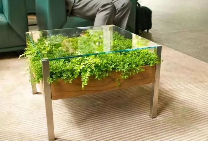 Живой уголок можно устроить в любой комнате квартиры. Не обязательно это должны быть целые зеленые стены или заросли комнатных цветов. Оригинальное «живое» оформление журнальных столиков привнесет нужный природный акцент в интерьер и сделает его более умиротворяющим и естественным. Под стеклом можно разместить неприхотливый мох, различные по расцветке суккуленты или другие растения с небуйным ростом.