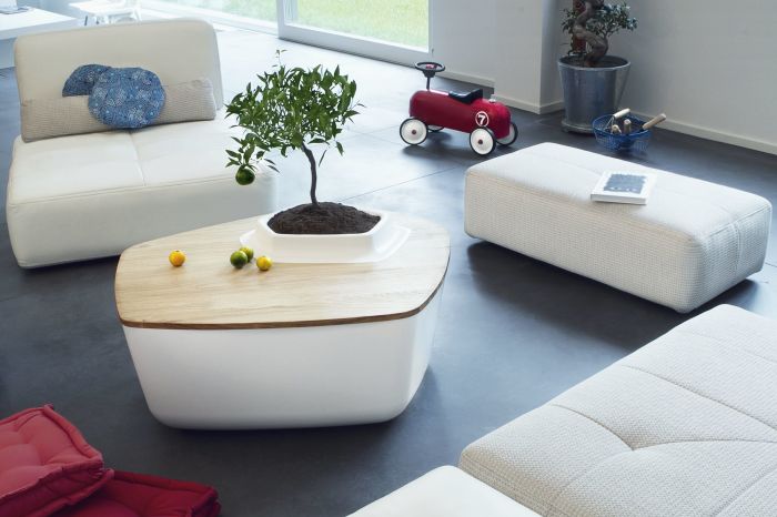 Есть и еще один вариант оформления: прямо в столе помещается островок земли, из которого растет цветок или дерево. Создается невообразимо удивительное ощущение, будто растение прорастает сквозь мебель.