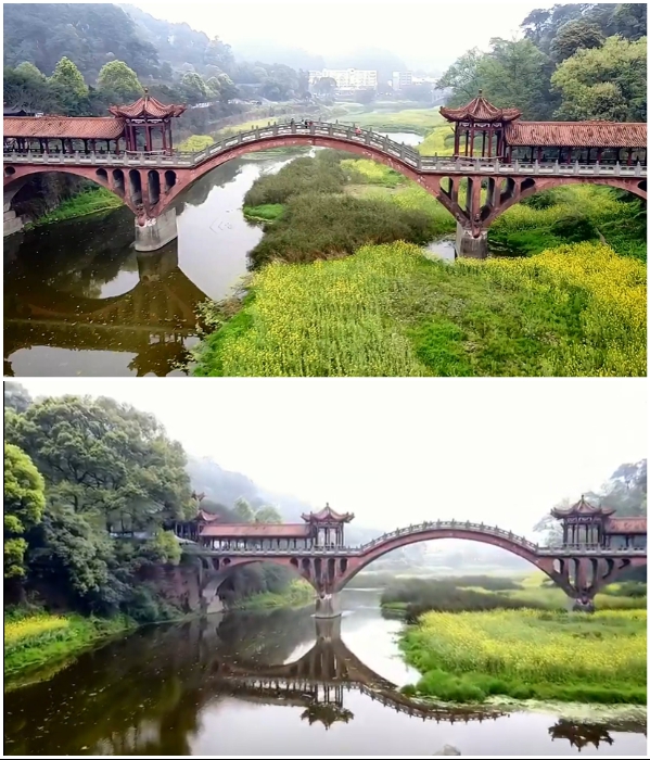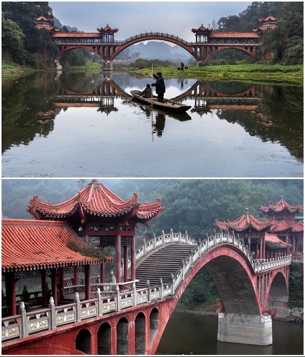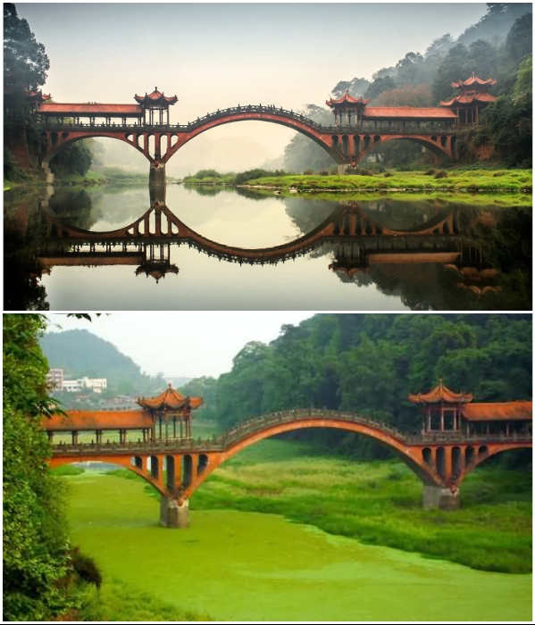 Мост не всегда может порадовать идеальным отражением, а вот красота архитектурных форм впечатляет (Эмэйшань, Китай). | Фото: askideas.com.