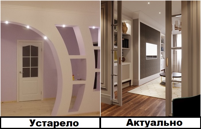 Гипсокартонные перегородки с нишами, оснащенные внутренне подсветкой, фигурные фальшстенки, художественные арки, выстроенные в узких коридорах – все это устарело. Подобные конструкции пришли к нам из 2000-х и, к сожалению, не торопятся покидать современные квартиры. Их главный минус заключается в том, что они занимают много места и «съедают» все пространство, особенно если речь идет о малогабаритных квартирах. Кроме того, в 2020 году в моде просторные светлые комнаты, а архитектурные излишества в виде ниш, арок только загромождают пространство.