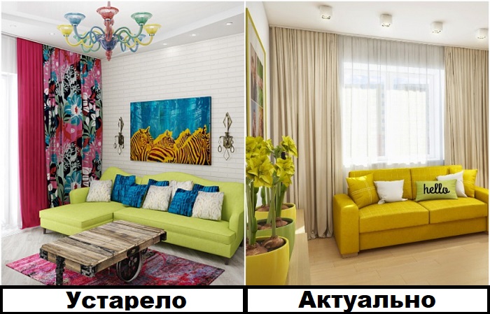 Ярко-желтые диваны, зеленый шкаф, розовые фоторамки, бирюзовые подушки – еще несколько лет назад такая любовь к цвету считалось очень актуальной и современной. Подобный коктейль сам по себе выглядел очень оригинально, взрывая сознание, а помещенный на светлый фон, превращался в декорацию-манифест нового поколения.