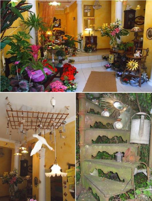 При украшении фасадов, входа в лавку и даже самого тротуара Бруно одними лейками не ограничивается. Здесь можно увидеть оригинальные композиции из сезонных цветов, вечнозеленых вьющихся растений, различных вазонов, необычных и раритетных предметов декора. «Участниками» нетривиального показа и украшательства становятся рождественские венки с елочными или детскими игрушками, ярко-оранжевые тыквы, винтажные садовые кресла и хрустальные люстры – все зависит от времени года, приближающихся праздников и настроения самого создателя.