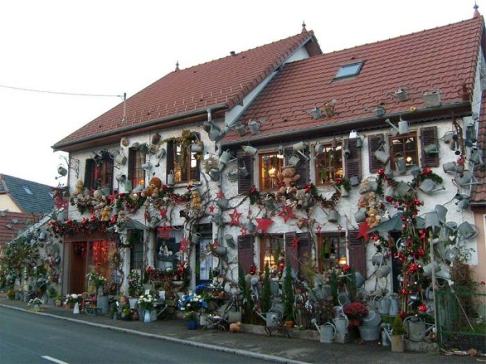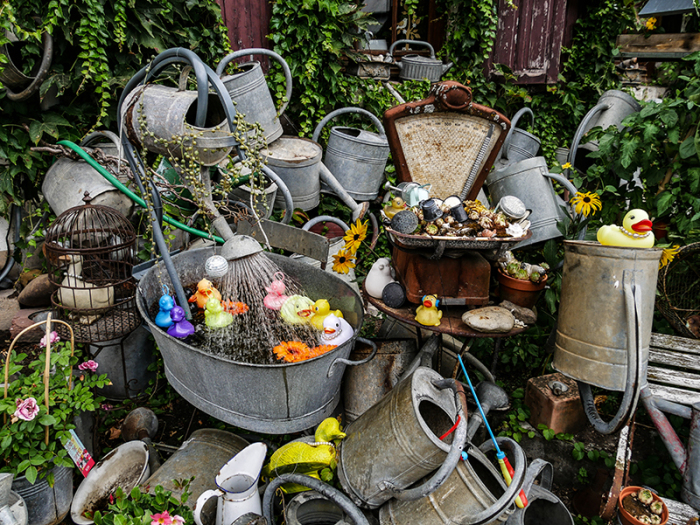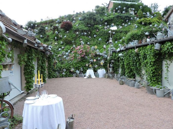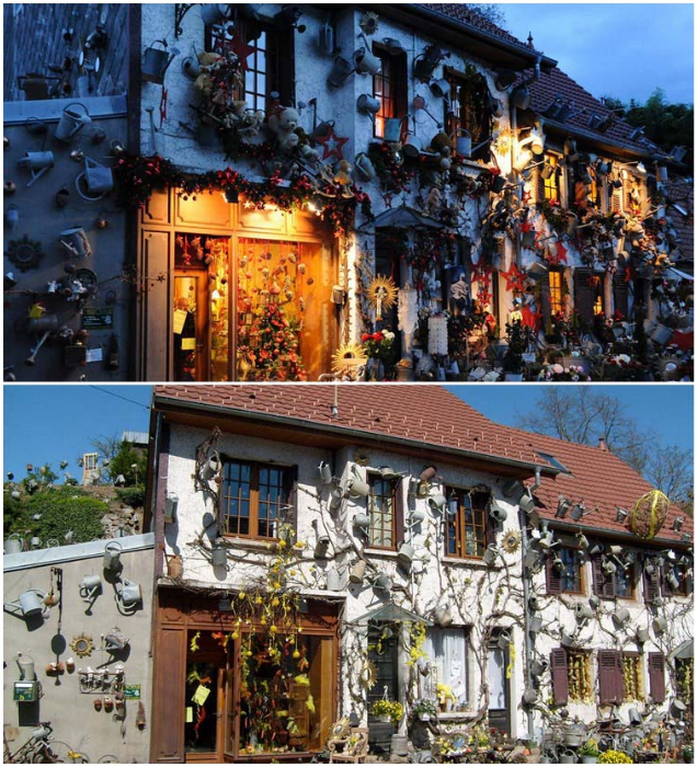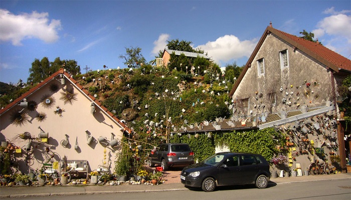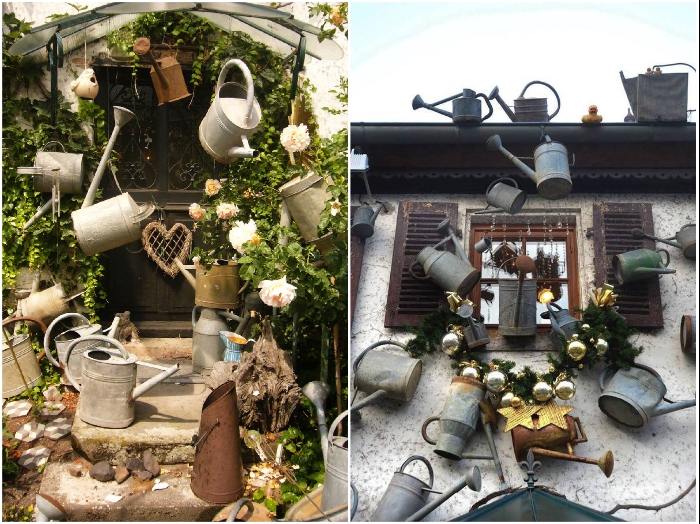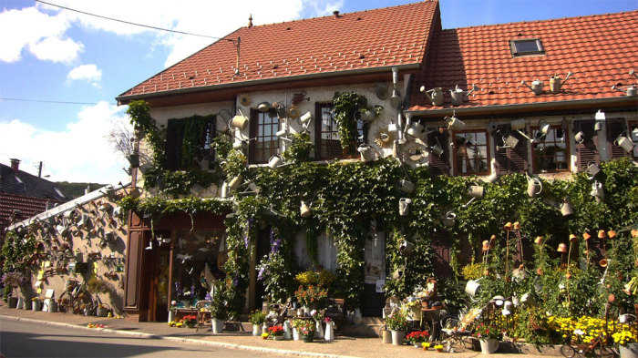 Необычное дизайнерское решение одного флориста из крошечной деревеньки на северо-востоке Франции сделало его знаменитым на весь мир. Как оказалось, Бруно Гейер, увлечен не только разведением цветов, но и коллекционированием леек для полива садовых растений. Причем этой странной коллекцией, насчитывающей более 800 предметов, он решил украсить фасад не только своего цветочного магазина, но и дома, и даже склоны холма, расположенного рядом.