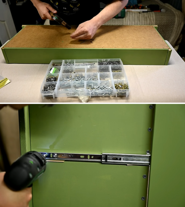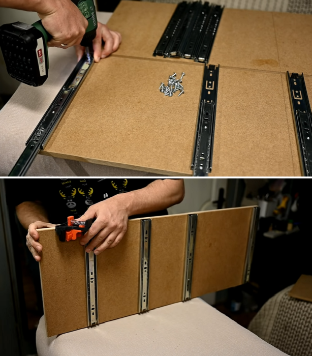 После того как собрали ящики без дна, можно заниматься установкой направляющих на боковых стенках комода. Для этих целей требуется приобрести выдвижную систему нужной длины. Приобретенные элементы надежно закрепляются на нужном расстоянии с помощью коротких саморезов. Делается это на двух боковинах из внутренней стороны.