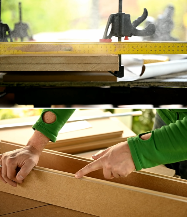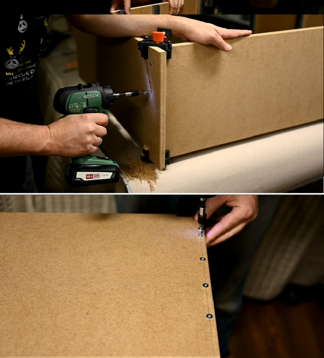 В домашних условиях самой большой сложностью сборки подобных конструкций является закрепление всех 4 сторон будущего комода. Для этого понадобится не только ровная поверхность, но и струбцины, и ловкий помощник. В идеале этот процесс лучше проводить на верстаке. Когда все части комода собраны воедино и результат вас устроит, его следует полностью ...разобрать.