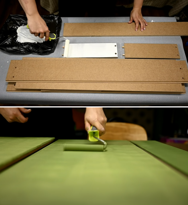 Стоит помнить, что каждый слой лакокрасочного покрытия должен полностью высохнуть. Выдержав нужное время для сушки, можно приступать к окончательной сборке всех деталей. Сначала собираются каркасы выдвижных ящиков, а затем надежно и качественно закрепляется дно из фанеры. После этого устанавливаются направляющие на боковых сторонах каждого ящика.