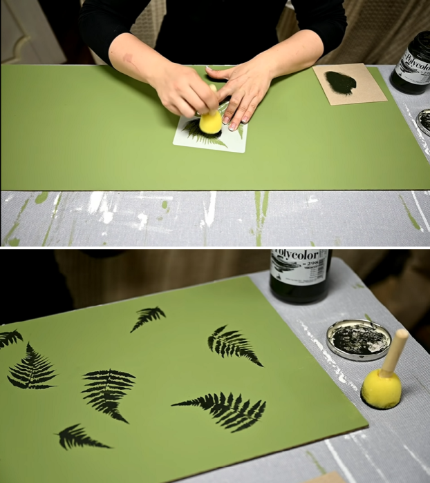 Чтобы привнести нотку оригинальности, Ирина решила украсить дно выдвижных ящиков. Для этого она использовала обычный трафарет с изображением листа папоротника и краску более контрастных тонов. После того, как все детали и украшения полностью высохли, их вскрыли бесцветным лаком на водной основе. Это позволит продлить срок службы покрытия и придаст глянцевый блеск, если выбрать соответствующий лак. В том случае, если хотите придать своей мебели бархатистый оттенок, то выбирать следует матовый лак.