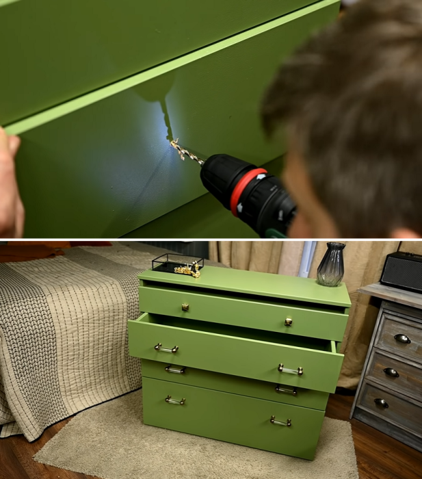 Когда каркас собран и ящики уже установлены, остается лишь прикрутить выбранные заранее ручки и устанавливать готовый комод на свое место. В том же случае, когда в наличии оказалась фурнитура разной формы, следует продумать, как ее разместить, чтобы не испортить вид новоиспеченного комода. Более подробно увидеть весь процесс создания стильного комода можно на видео, снятом творческим дуэтом. Если в домашнем арсенале нет такого количества электроинструмента, то можно преобразовать и базовую модель от IKEA. Как например, это сделала американская блогер Эрин Спейн, превратив комод из необработанных плит МДФ в оригинальный и стильный предмет мебели.