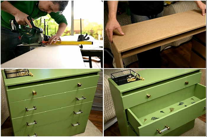 Ирина со своим мужем - довольно творческие люди, которые многое делают своими руками, используя лишь доступные и бюджетные материалы, а также минимальный набор инструментов для домашнего пользования. На этот раз семейная пара, увлекающаяся съемками собственных видеороликов, решила, что в их спальню крайне необходим вместительный комод. Только вот в мебельный салон они не спешили, а принялись за дело самостоятельно. Учитывая, что у них все же имеется опыт работы с пиломатериалами, они приобрели стандартные доски МДФ без какой-либо обработки. Как оказалось, это самый лучший из бюджетных материалов, который легко поддается различной обработке и при этом долговечный, не теряет формы, не расслаивается на срезах, а также его можно красить без тщательной подготовки поверхности. И что самое главное, плиты МДФ ни в чем не уступают натуральному дереву, а в некоторых моментах даже более практичные.