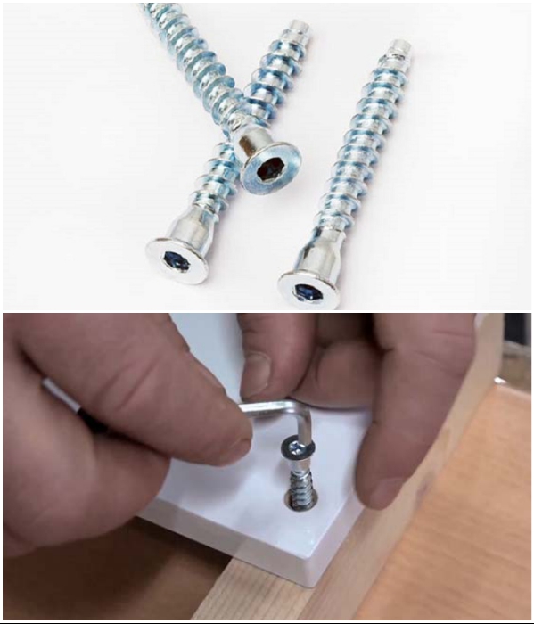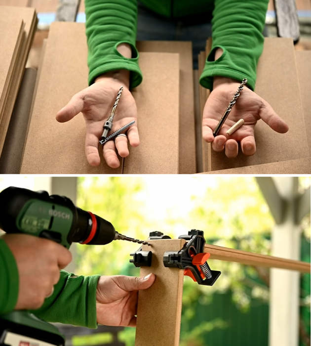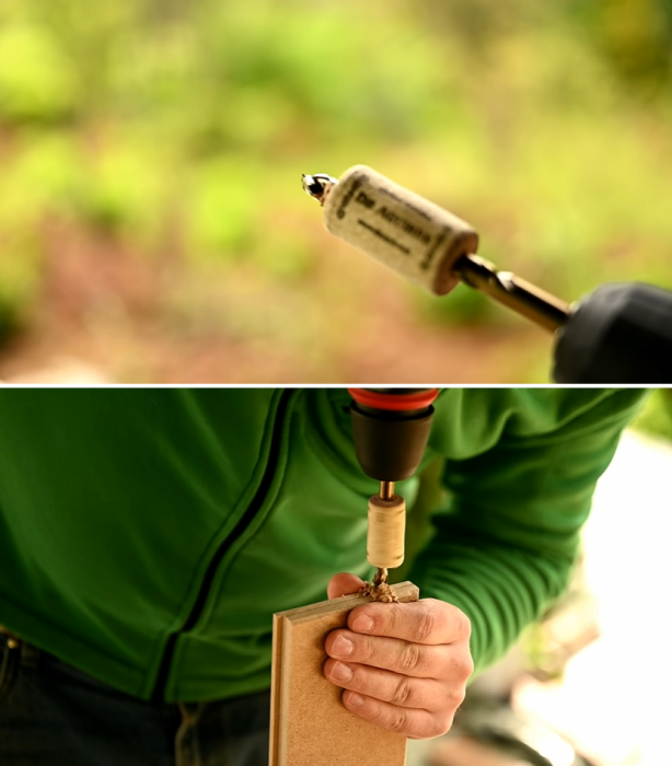 Отверстия для каждого вида соединительных элементов нужно делать только по середине торца детали и определенным сверлом. Для того, чтобы определиться с глубиной отверстия, блогеры советуют просверлить обычную винную пробку так, чтобы свободный конец сверла имел нужную длину. Именно она станет нужным фиксатором глубины. Когда нестандартное приспособление будет готово, следует просверлить отверстия в верхних и боковых деталях каркаса комода. Чтобы не испортить фасады ящиков, глубину на которую уйдет шкант, нужно тщательно рассчитать и сместить пробковый ограничитель на нужную длину.