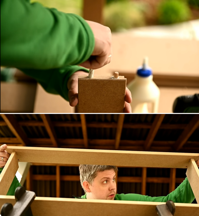 После того как все отверстия будут готовы, каркас ящиков можно собирать. Сначала шканты забиваются в торцевую часть боковин, а потом на них одевается фасадная деталь. По такому же принципу собираются все оставшиеся выдвижные ящики.