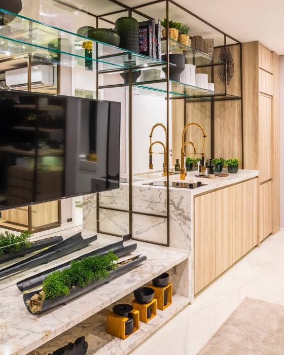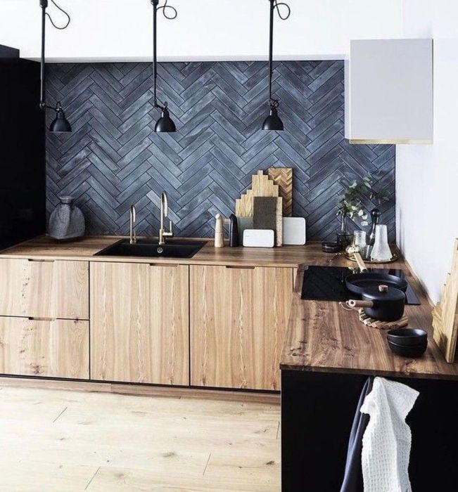 Также очень важно иметь представление о том, какой высоты будет ваш гарнитур. Лучше всего работают варианты с очень узкими (неглубокими) верхними шкафчиками и тоже узкой (неглубокой) столешницей нижней части гарнитура. Отлично смотрятся и кухни без шкафчиков наверху, только с полочками.
